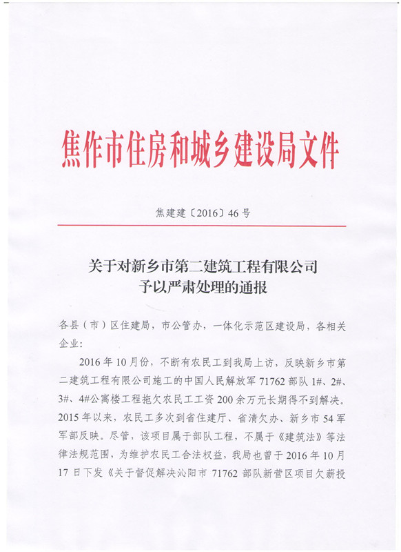 關(guān)于對新鄉(xiāng)市第二建筑工程有限公司予以嚴(yán)肅處理的通報