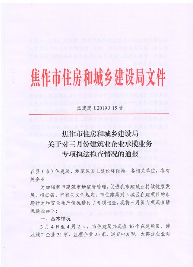 焦作市住房和城鄉(xiāng)建設(shè)局關(guān)于對(duì)三月份建筑業(yè)企業(yè)承攬業(yè)務(wù)專項(xiàng)執(zhí)法檢查情況的通報(bào)