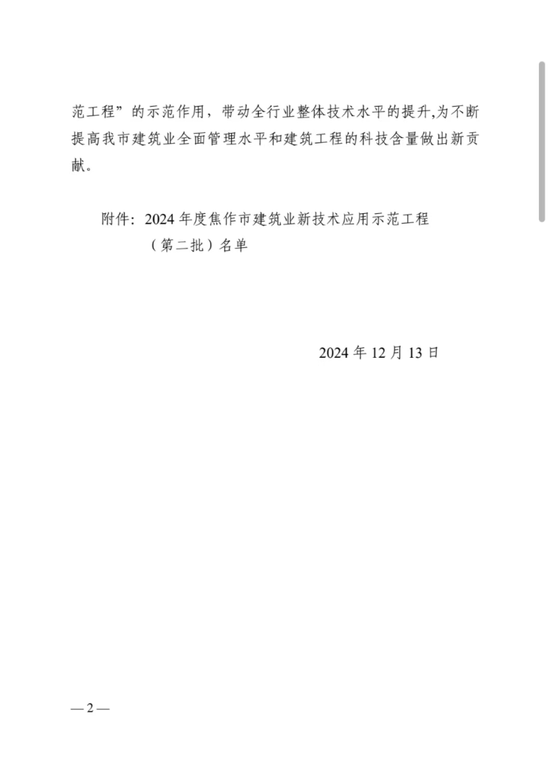 關(guān)于公布2024年度焦作市建筑業(yè)新技術(shù)應(yīng)用示范工程(第二批)名單的通知